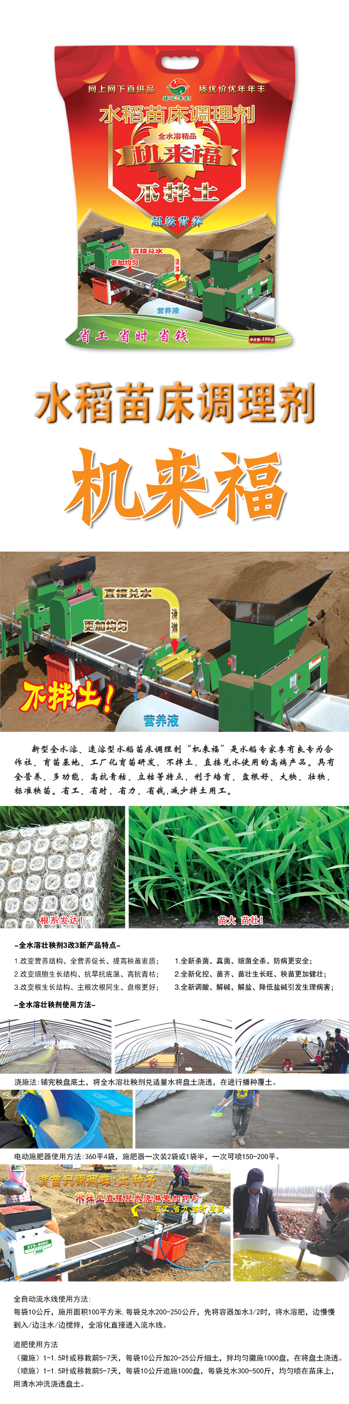 新型全水溶、速溶型水稻苗床調(diào)理劑“機(jī)來福”是水稻專家李有良專為合作社、育苗基地、工廠化育苗、機(jī)插秧育苗研發(fā),不拌土,直接兌水使用的高端產(chǎn)品。具有全營養(yǎng)、多功能,高抗青枯、立枯等特點(diǎn),利于培育、大秧、壯秧、盤根好,標(biāo)準(zhǔn)秧苗省工、省時(shí)、省力、省錢,減少拌土用工,降低育苗成本,使用更加方便。