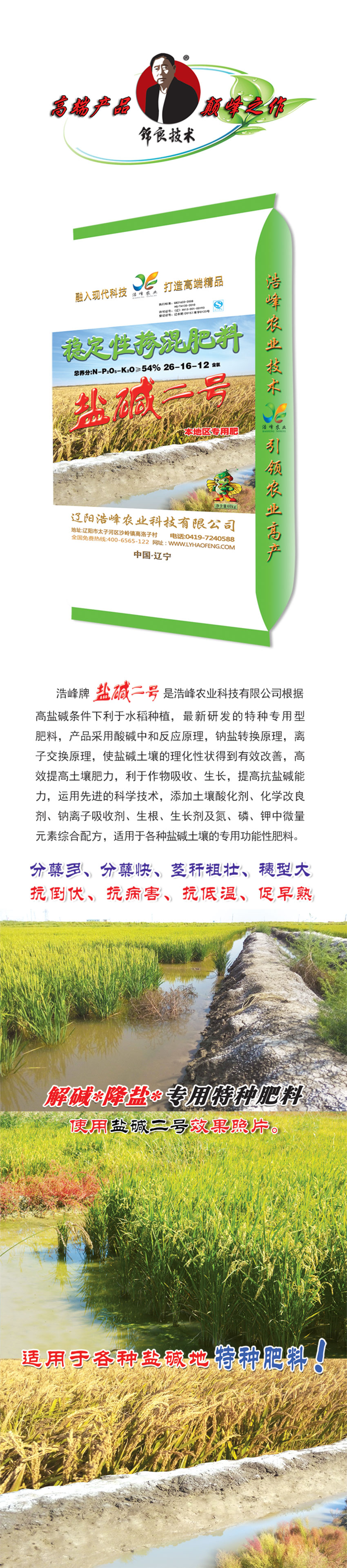 浩峰牌鹽堿二號(hào)是浩峰農(nóng)業(yè)科技有限公司根據(jù)高鹽堿條件下利于水稻種植,最新研發(fā)的特種專用型肥料,產(chǎn)品采用酸堿中和反應(yīng)原理,鈉鹽轉(zhuǎn)換原理,離子交換原理,使鹽堿土壤的理化性狀得到有效改善,高效提高土壤肥力,利于作物吸收、生長(zhǎng),提高抗鹽堿能力,運(yùn)用先進(jìn)的科學(xué)?,添加土壤藥F?、化学改良剂、脑u(píng)胱游占?、生根、生长剂及氮、磷、钾中微量元素综簢樹穭Μ室暶釉嶗种盐煎{寥賴淖ㄓ霉δ芐苑柿稀?