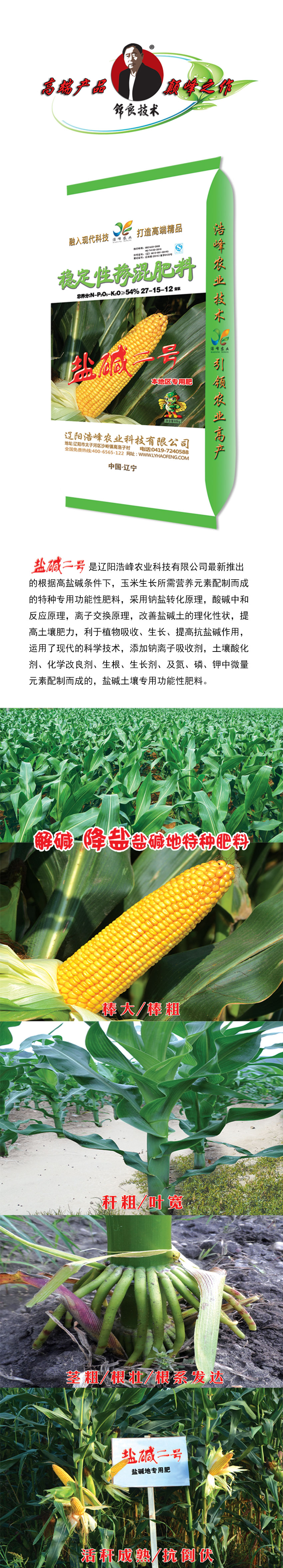 鹽堿二號是遼陽浩峰農(nóng)業(yè)科技有限公司最新推出的根據(jù)高鹽堿條件下,玉米生長所需營養(yǎng)元素配制而成的特種專用功能性肥料,采用鈉鹽轉(zhuǎn)化原理,酸堿中和反應(yīng)原理,離子交換原理,改善鹽堿土的理化性狀,提高土壤肥力,利于植物吸收、生長、提高抗鹽堿作用,運用了現(xiàn)代的科際?,添加脑u胱游占?,土壤藥F?、化学改良剂、生根、生长剂、及氮、磷、钾中微量元素配重汎成的,盐煎{寥雷ㄓ霉δ芐苑柿稀?