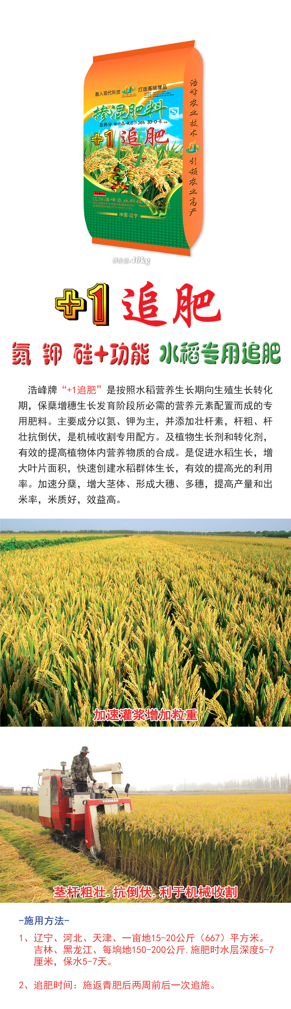 浩峰牌“+1追肥”是按照水稻營(yíng)養(yǎng)生長(zhǎng)期向生殖生長(zhǎng)轉(zhuǎn)化期,保蘗增穗生長(zhǎng)發(fā)育階段所必需的營(yíng)養(yǎng)元素配置而成的專(zhuān)用肥料。主要成分以氮、鉀為主,并添加壯桿素,桿粗、桿壯抗倒伏,是機(jī)械收割專(zhuān)用配方。及植物生長(zhǎng)劑和轉(zhuǎn)化劑,有效的提高植物體內(nèi)營(yíng)養(yǎng)物質(zhì)ず銑傘J譴俳舊ぃ齟笠鍍婊燜俅唇ㄋ救禾逕?,有效的提高光的利用率。尖欃分蘖,札e缶ヌ?、芯暭嗴穗、多穗,提高产量航y(tǒng)雒茁剩字屎?,效益高?