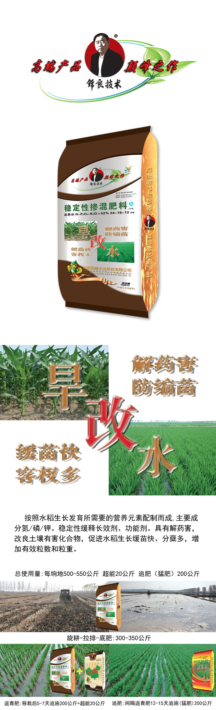 按照水稻生長(zhǎng)發(fā)育所需要的營(yíng)養(yǎng)元素配制而成,主要成分氮/磷/鉀。穩(wěn)定性緩釋長(zhǎng)效劑、功能劑。具有解藥害,改良土壤有害化合物,促進(jìn)水稻生長(zhǎng)緩苗快、分蘗多,增加有效粒數(shù)和粒重。